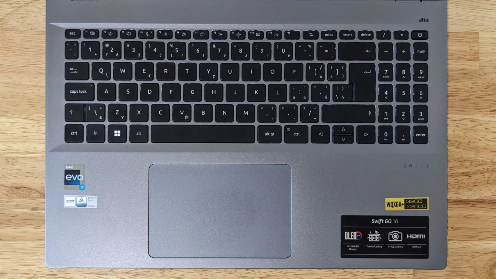 Swift Go 16 je tenký (15 mm) a lehký (1,63 kg) notebook, přitom s plnohodnotnou klávesnicí a obrazovkou typu OLED, která jinak na hmotnosti spíše přidává. Tělo notebooku je vyrobeno z hliníku s výjimkou úzkého plastového dílu na spodní straně. V těchto místech jsou totiž umístěné antény bezdrátové sítě.