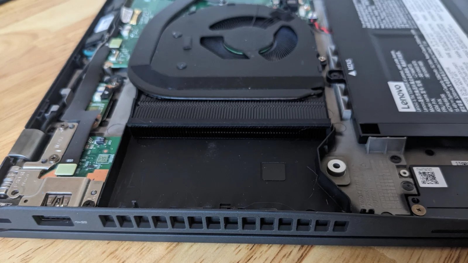 Mezi výdechem větráku a mřížkou na boku notebooku je hodně volného místa, což může být z důvodu, aby se vzduch před opuštěním notebooku mírně ochladil, ale také kvůli snížení hlučnosti – menší turbulentní proudění a současně vyšší průtok vzduchu.