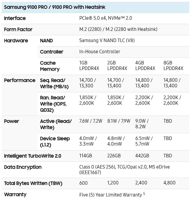 Moduly SSD 9100 Pro budou vyráběné v klasickém provedení M.2 a s kapacitami 1 TB, 2 TB a 4 TB. Později má přibýt ještě 8TB model, to ale až v druhé polovině roku. To by bylo poprvé, kdy Samsung tuto kapacitu bude nabízet u nejrychlejších SSD. Moduly jsou založené na V-NAND (3D NAND) 8. generace od Samsungu se záznamem TLC a používají mezipaměť LPDDR4X. Zapisovací záruka není bohužel vyšší než u běžných SSD, je na úrovni 600 přepisovacích cyklů na buňku.