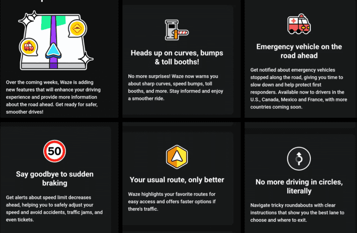 Specifickou novinkou je upozornění na přítomnost vozidel záchranných složek na trase. Funkce má řidiče včas připravit na nutnost uvolnit cestu nebo počítat s omezením provozu. Zatím je dostupná jen ve vybraných zemích: USA, Kanada, Mexiko a Francie. Postupně by se měla rozšiřovat i do dalších zemí, kde se podaří propojit navigaci s aktuálními daty o poloze záchranných složek.