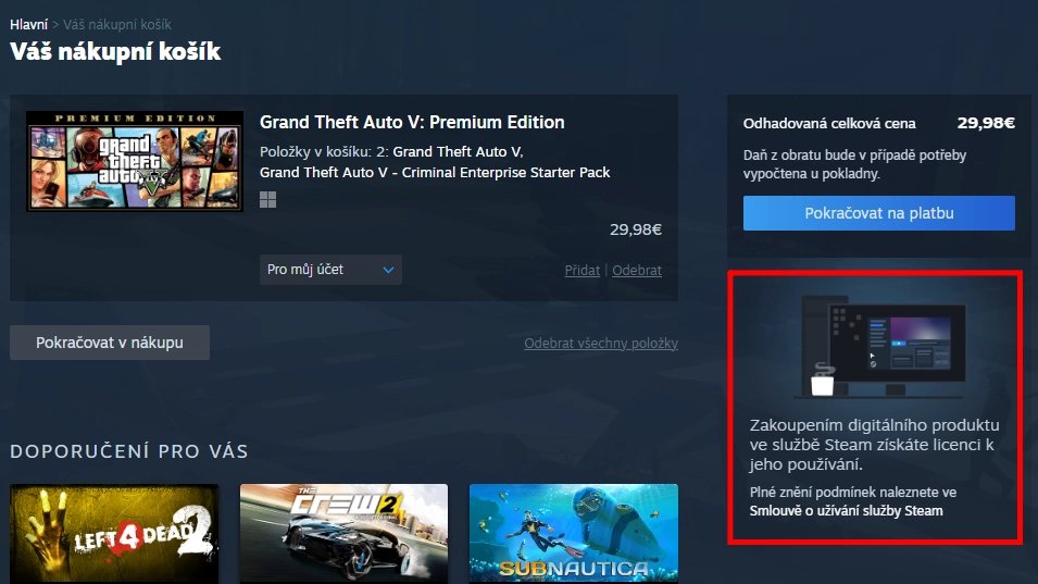 Nyní se po otevření nákupního košíku na Steamu zobrazí oznámení: „Nákupem digitálního produktu získáte licenci na tento produkt ve službě Steam.“ U her či jiných produktů by nemělo být tlačítko typu „Koupit“.