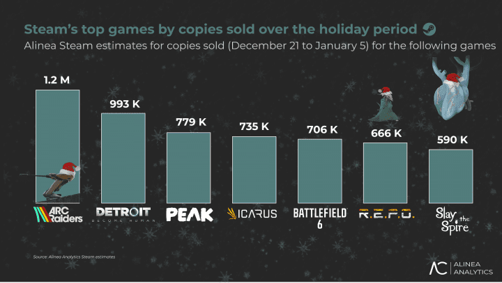 Největším zlatým prasátkem je tradičně Counter-Strike 2. Hned za ním následovala novinka ARC Raiders, které se během pouhých dvou týdnů (od 21. prosince do 4. ledna) prodalo zhruba 1,2 milionu kopií. Hra tak Steamu přinesla přibližně 32 milionů dolarů a celkově má na kontě asi 12 milionů prodaných kusů (z toho 7 milionů na Steamu).