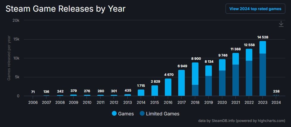 Až na pár výjimek vychází na Steamu vždy více her než v předchozím roce. A právě v tom loňském podle databáze SteamDB vyšlo na Steamu celkem 14 528 her, což zprůměrováno a zaokrouhleno vychází na nějakých 40 her denně. Největší „boom“ nastal přibližně v roce 2014, kdy Steam dramaticky změnil pravidla pro přidání her a na platformu se tak bez jakékoliv „kontroly kvality“ mohly vrhat desítky lepších či horších herních titulů.