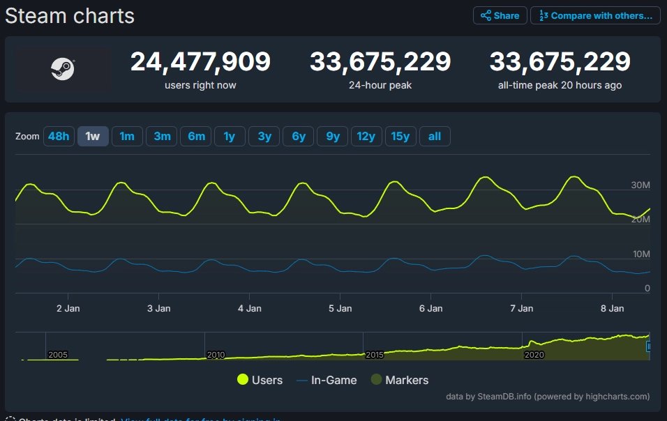 Pro kontext se nejedná o počet uživatelů, kteří v jeden moment hrají nějakou hru, ale o počet aktuálně přihlášených uživatelů. Pro nalezení odpovědi ohledně hráčů ve hře v jeden moment opět poslouží databáze SteamDB. Podle ní si Steam udržuje přibližně od 5 do 10 milionů hráčů napříč různou denní dobou.