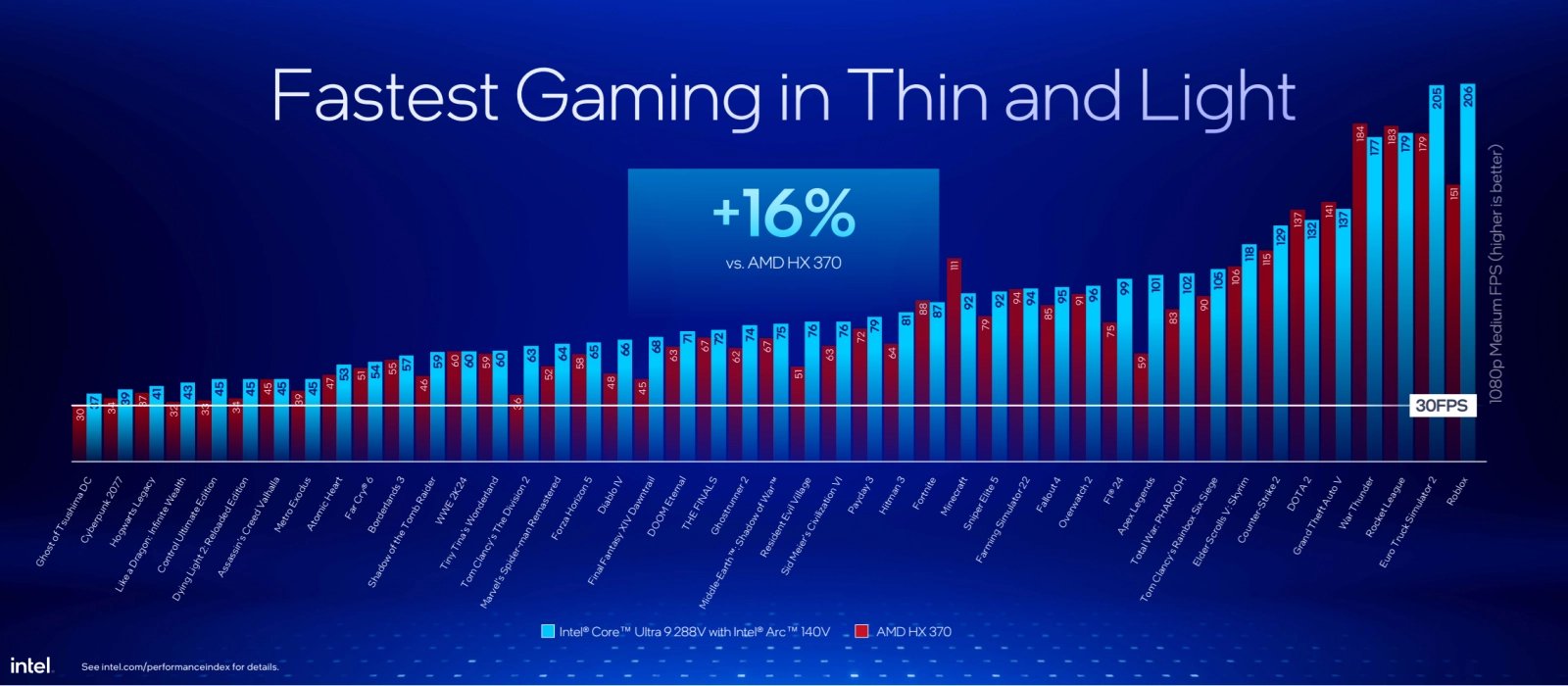 Podle tvrzení Intelu by dokonce Lunar Lake mělo převzít i titul nejvýkonnějšího integrovaného GPU, přinejmenším v segmentu procesorů s nižšími spotřebami. Intel slibuje, že by grafika Arc 140V procesoru Core Ultra 9 288V měla mít v testování (rozlišení 1080p) přes poměrně velkou skupinu her v průměru o 16 % vyšší výkon než Radeon 790M v procesoru AMD Ryzen AI HX 370 (v obou případech je to plně aktivní GPU daného procesoru s 1024 shadery). Zase je samozřejmě nejisté, zda to třeba není trošku ovlivněno volbou spotřeby a skladbou her. AMD Ryzen AI 300 (APU Strix Point) je procesor zaměřený na o něco vyšší kategorii výkonu, i když s Lunar Lake (které má maximální spotřebu až 37 W) má překryv.