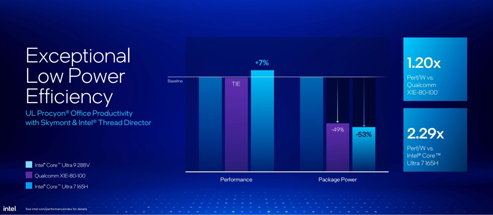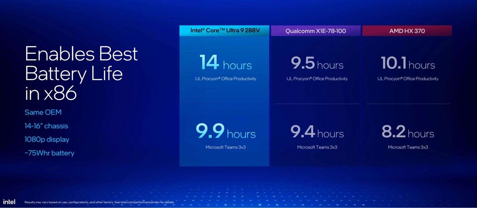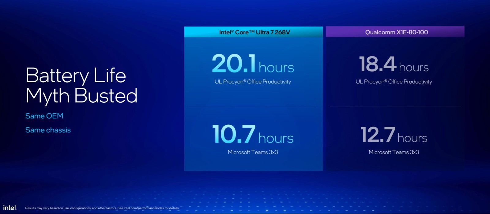 Intel dokonce v prezentaci tvrdí, že Lunar Lake / Core Ultra 200V rozbíjí „mýtus“ o tom, že procesory ARM jsou z podstaty úspornější a efektivnější. Firma uvádí příklad notebooku se stejným výrobcem a stejným šasi, ve kterém je procesor Core Ultra 7 268V schopen porazit ve výdrži na baterii Qualcomm Snapdragon X Elite (model X1E-80–100) s výdrží 20,1 hodiny proti 18,4 hodiny u notebooku s ARM čipem. Jde o výdrž při běhu benchmarku UL Procyon Office Productivity (simulace kancelářské práce).