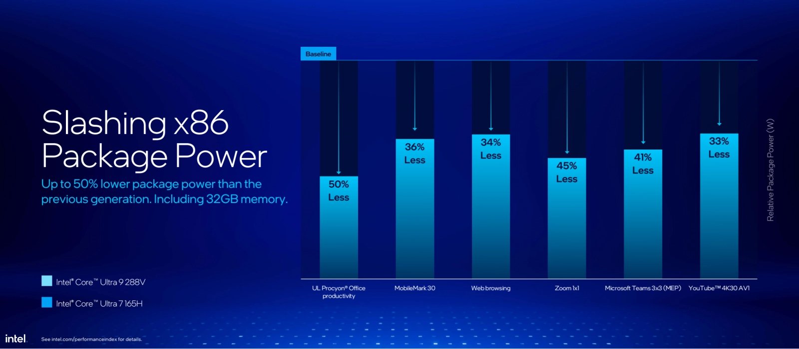 Proti procesorům Meteor Lake (Core Ultra 7 165H) má Lunar Lake (nejvyšší model Core Ultra 9 288V) mít až o 50 % nižší spotřebu v testu UL Procyon Office productivity, o 36 % nižší v Mobile Marku 30, o 34 % nižší při prohlížení webu, o 45 % nižší při hovoru přes Zoom, o 41 % nižší při videokonferenci 3×3 v MS Teams a o 33 % při přehrávání 4K30 videa ve formátu AV1 na YouTube. V tzv. package power je u Lunar Lake zahrnutá spotřeba 32GB paměti LPDDR5X osazené na procesoru, jejíž příkon by měl být nižší než u samostatné paměti osazené a započítané u procesoru Meteor Lake. To tvoří část těchto zlepšení.