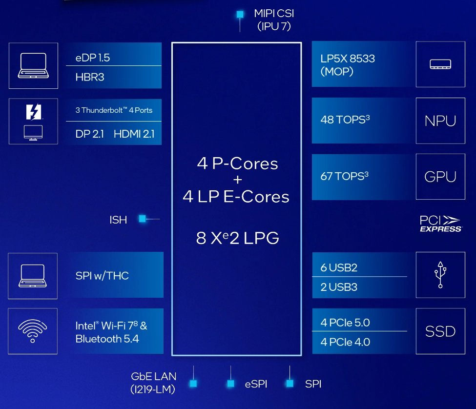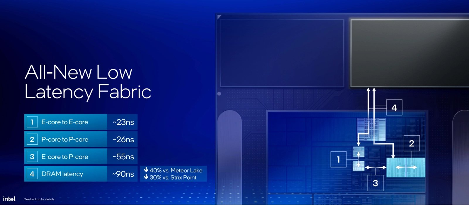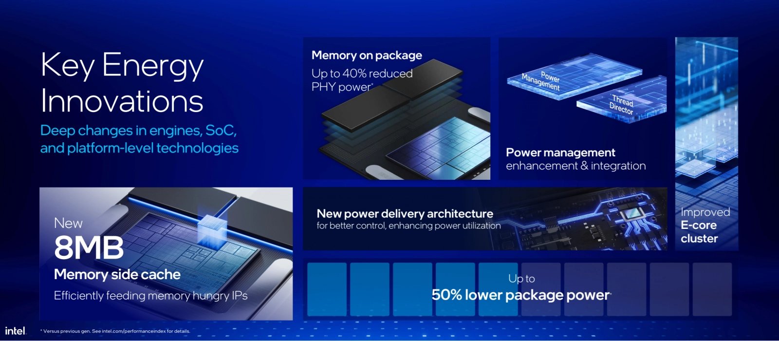 Současně má vylepšenou čipletovou (dlaždicovou) stavbu zaměřenou na vysokou energetickou efektivitu a výdrž na baterie, včetně paměti LPDDR5X osazené přímo na pouzdru procesoru – tento SoC má i v tomto ambici konkurovat procesorům Applu, jako jsou M3 a M4.