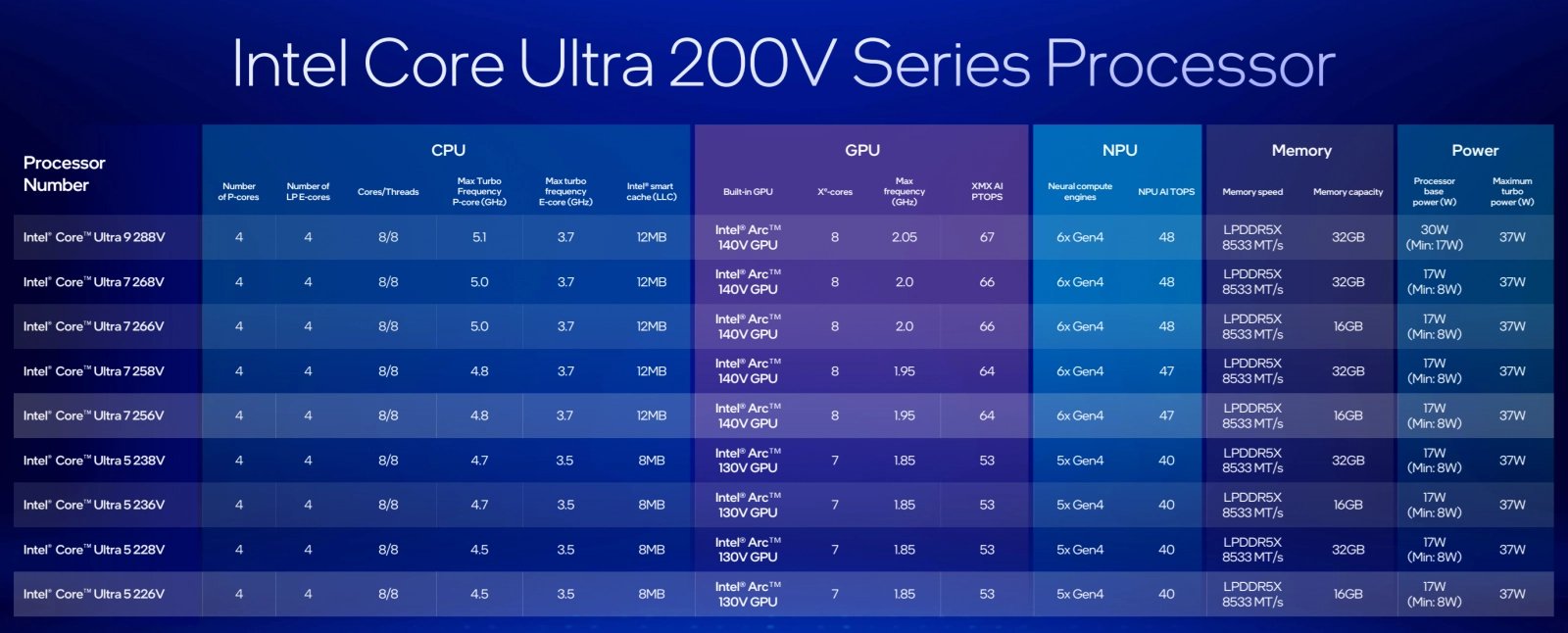 Modely Core Ultra 5 238V (32 GB) a Core Ultra 7 236V (16 GB) mají maximální boostový takt velkých jader 4,7 GHz, u jader E-Core je takt 3,5 GHz. Grafika má takt 1,85 GHz. Levnější varianty jsou Core Ultra 5 228V (32 GB) a Core Ultra 5 226V (16 GB), u těch je maximální takt P-Core snížený na 4,5 GHz, ale takt E-Core a takt GPU zůstávají stejné.