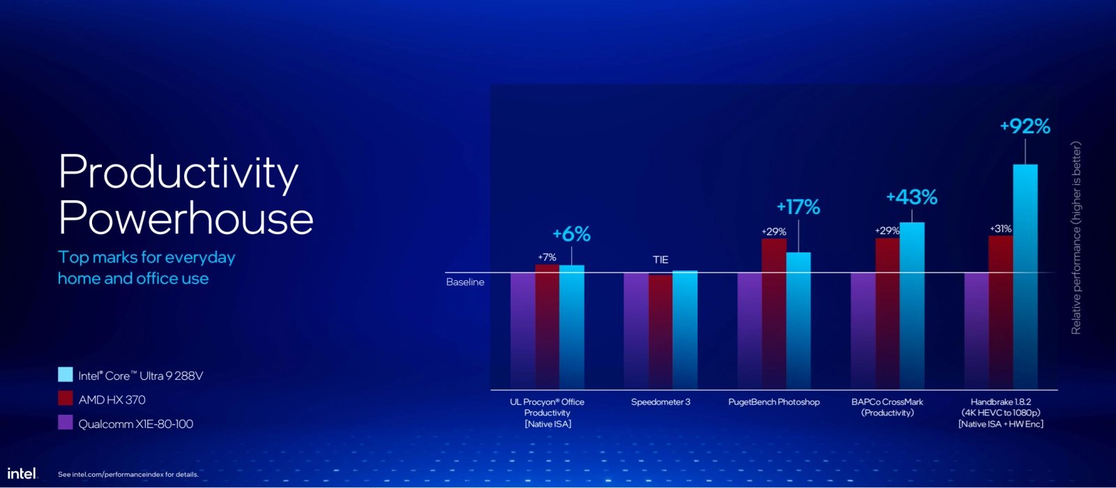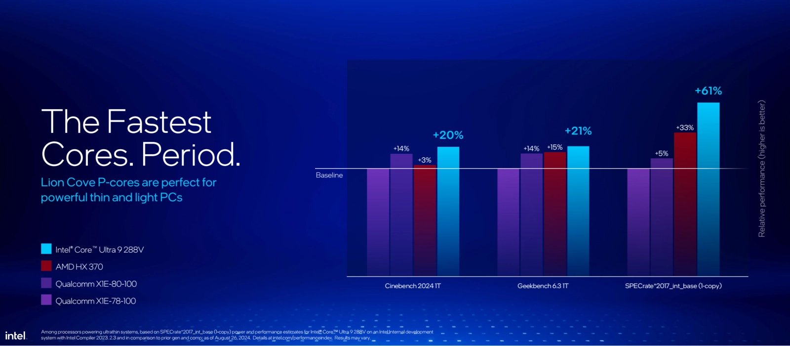 Podle Intelu má Lunar Lake (Core Ultra 9 288V na 5,1 GHz) primát v jednovláknovém výkonu procesorového jádra nad nejnovějšími procesory AMD (Ryzen AI 300, konkrétně model HX 370, který má stejný takt boostu 5,1 GHz) i ARM čipy od Qualcommu (Snapdragon X Elite X1E-80–100).