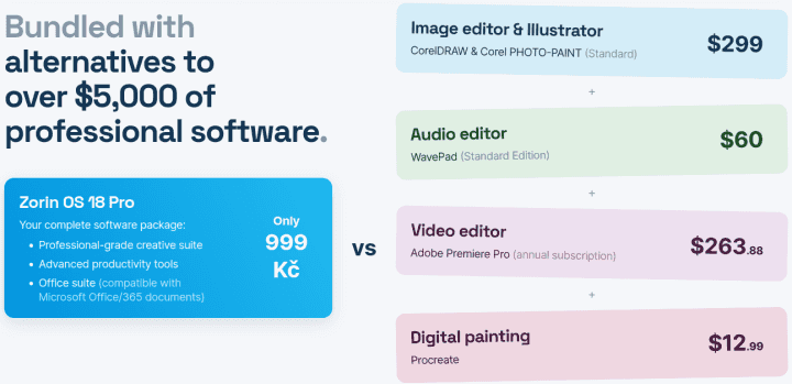 Také Zorin OS má placenou verzi, za své prodejní praktiky ale občas schytává kritiku. Alternativy k profesionálnímu software v hodnotě $5000 nejsou nic jiného než open-source aplikace, které si můžete zdarma stáhnout na jakýkoliv jiný OS.