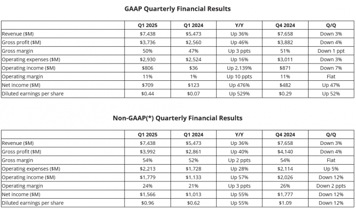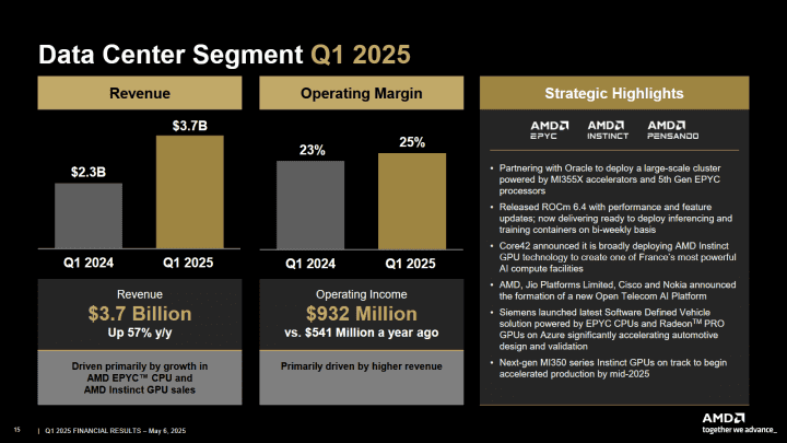 Začátkem roku při oznámení předchozích výsledků AMD uvádělo na první kvartál roku 2025 (Q1 2025) očekávání tržeb ve výši 7,1 miliardy $ s tolerancí 300 milionů $ (tedy 6,8–7,4 miliardy $). Firmě se to podařilo o kus předstihnout – tržby skončily na čísle 7,438 miliardy $. Což je sice mezikvartálně o 3 % méně proti poslední čtvrtině loňského roku, ale to je celkem normální, protože obvykle bývá Q1 sezónně slabší než Q4 kvůli charakteru spotřebitelské poptávky. Meziročně ale tyto tržby představují nárůst o 36 %.
