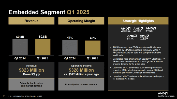 Nakonec ještě segment Embedded, v kterém jsou zejména FPGA a další produkty Xilinx. Tržby v něm byly 823 milionů $, což je meziročně zhoršení o 3 %. Podle AMD je dáno tím, že poptávka celého trhu zůstává nízká. Provozní zisk byl 328 milionů $, což je meziročně propad o 4 %.