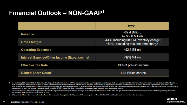 Firma také ale má v Q2 zaúčtovat postih ve výši 800 milionů $ z hodnoty skladových zásob, který je způsobený omezeními exportu. Tím se zřejmě myslí americký zákaz vývozu výpočetních GPU do Číny, který vedle Nvidie postihne i AMD (firma už nesmí do Číny exportovat ořezané GPU Instinct MI308, které vzniklo kvůli předchozím sankcím). Tento postih sníží zisk a hrubou marži. Non-GAAP marže bude jen okolo 43 % (bez tohoto postihu by byla 54 %, což je stejná hodnota jako Non-GAAP marže v Q1 2025).