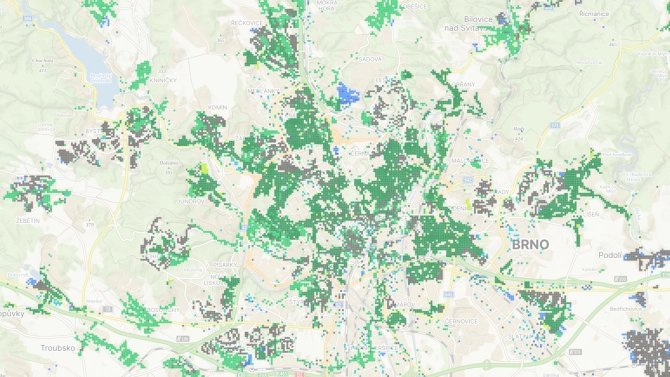 Mapu si můžete nastavit tak, aby zobrazovala počet poskytovatelů internetu na daných adresách, barevně odlišovala typ technologie (optika, xDSL, kabel…).
